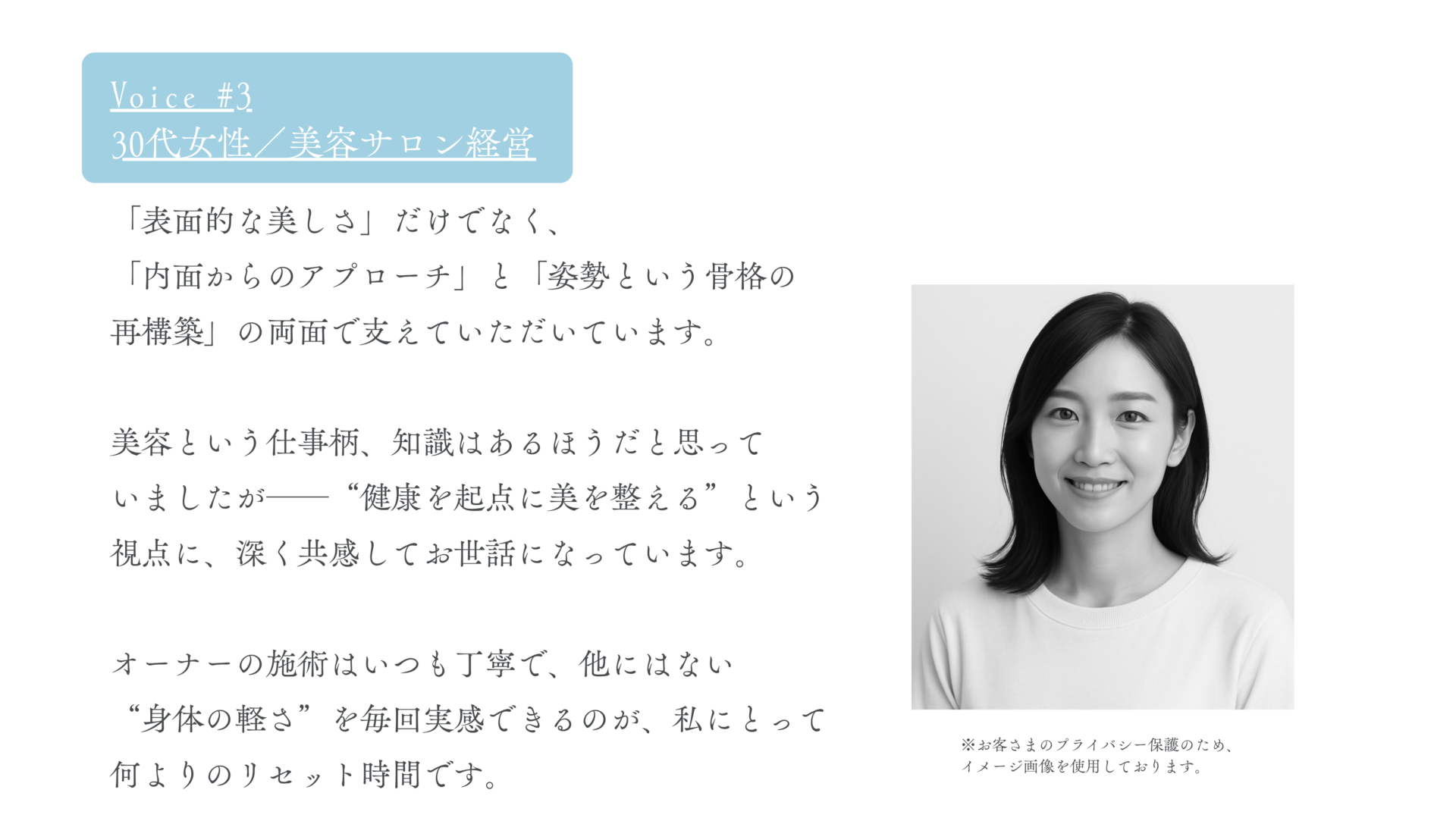 田中順子さま いつも変わらぬご信頼をお寄せくださり、心よりありがとうございます。 10年というご縁のなかで、こうしてご自身の身体や感覚にあらためて目を向けていただけたこと── その変化の言葉一つひとつが、私にとっても本当に嬉しく、心に残るご感想でした。 “気づかないうちに頑張っていた自分”にふと気づいていただけたこと、そして、歩く・寝るといった日常が軽やかに変わった体感を共有いただけたことに、感謝しております。 これからも、必要なタイミングでふっと立ち寄れる場所であり続けられるよう、丁寧に向き合ってまいります。 今後とも、どうぞよろしくお願いいたします。